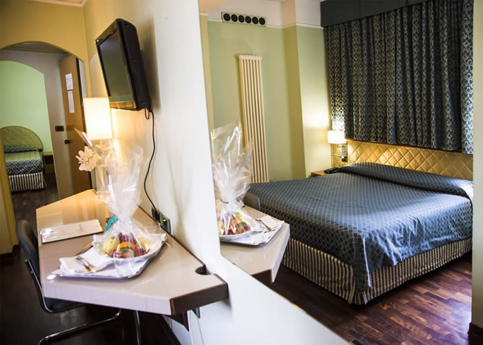 80 camere, 76 doppie, 2 singole e 2 suite. Tutte dotate di riciclo aria, frigobar, TV, cassaforte, Internet, telefono diretto, servizio lavanderia, room service 24 h.